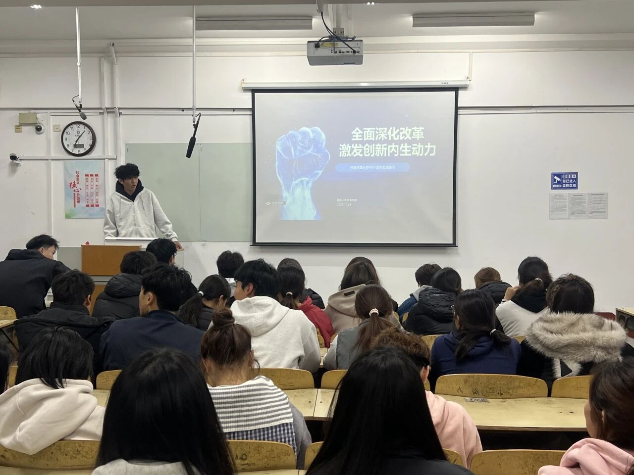 为了深刻解读国家关于全面深化改革的战略部署,使同学们充分认识改革是驱动发展的根本动力。聊城大学体育学院科创发展部于10月24日在聊城大学西校区8#509教室开展“全面深化改革,激发创新内生动力”活动。本活动是在马克思主义学院思政课教师的理论指导下开展的,旨在引导学生将思政理论与科创实践深度融合。 活动负责人姜宇欢通过思想启迪与形式洞察、创新赋能与方案共创、成果展示与交流心得三种内容主题来开展活动。围绕最新的改革政策,帮助同学们把握创新的宏观方向并了解当前政的红利。根据当前政策与形式来进行改革创新设想的方案讨论,各小组精彩呈现其改革方案,互相学习优点,并深化对改革创新的理解。 活动开始,科创发展部张景皓围绕“认识改革创新是新时代的迫切要求”展开讲解,结合当下科创前沿案例,阐述改革创新对个人成长与社会发展的重要意义。随后,学生分组进行学生创新创业项目模拟实践,无不凸显争做改革创新生力军。活动最后,各小组展示成果点评时强调“要树立改革创新自觉意识,在实践中不断增强改革创新的能量本领”。 通过此次活动,学生对改革创新的时代要求有了更深刻的认识,在实践中提升了改革创新能力,进一步明确了以改革创新助力个人发展与社会进步的方向,为成为新时代改革创新的中坚力量奠定了基础。 (编辑人:何方呈)
