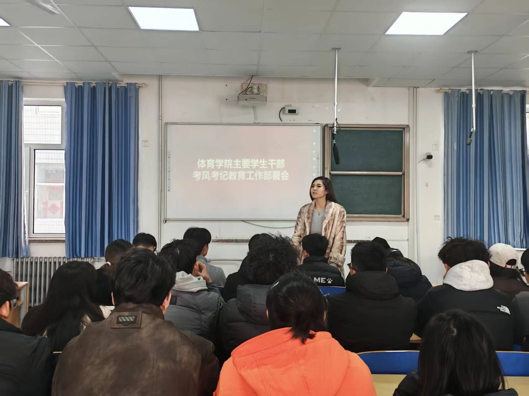 为进一步加强学风建设,严肃考试纪律,营造公平、公正、诚信的考试环境,近日,体育学院于西校区5#307组织召开主要学生干部考风考纪教育工作部署会。孔令泽老师担任主讲,由学院主要学生干部参加了本次会议。 会上,孔令泽围绕考风考纪主题作了重点讲解与部署。她深入阐述了诚信应考的重要性,指出考风考纪是学风建设的关键环节,直接关系到学生的品德修养与学业评价的公平公正。学生干部作为学生中的骨干力量,更应以身作则,率先垂范,不仅要自身严格遵守考试纪律,更要积极在同学中发挥宣传、引领和监督作用。 孔令泽结合相关规章制度与典型案例,对考试违纪行为的认定及后果进行了详细说明,警示大家务必抱有侥幸心理,牢固树立诚信意识。会议对期末阶段的考风考纪教育工作进行了具体部署,要求学生干部在各班级、各团队中扎实开展诚信考试宣传教育,将诚信应考、诚信参考的要求传达至每一位同学,共同维护良好的考试秩序。 通过本次会议,学生干部进一步明确了自身在考风考纪建设中的责任与担当,为在广大学生中有效传达诚信考试要求、凝聚纪律共识奠定了坚实基础。此次部署会有力的推动了学院期末考试的规范和有序进行,营造风清气正、诚实守信的优良学风。 编辑人:孙兴达