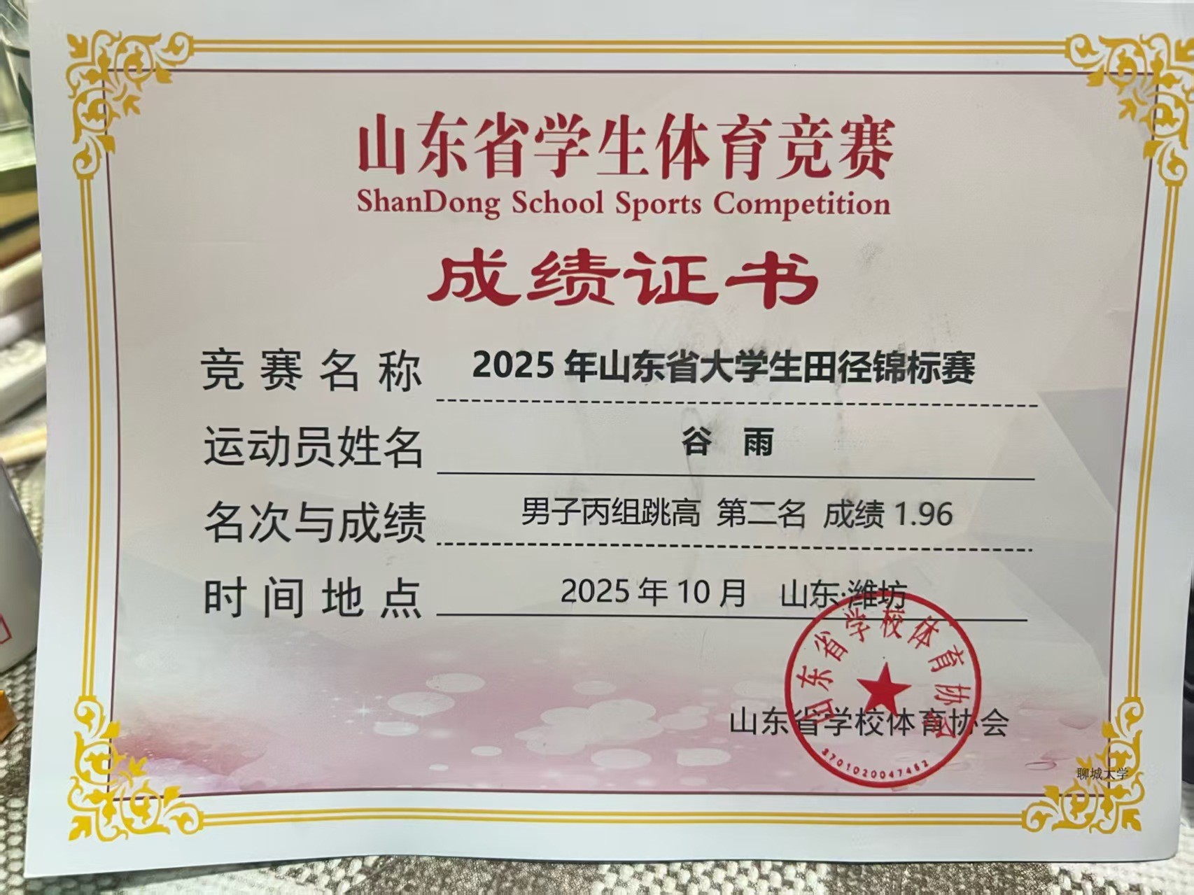 在2025年十月随聊城大学田径队参加2025年山东省大学生田径锦标赛获得男子丙组跳高第二名