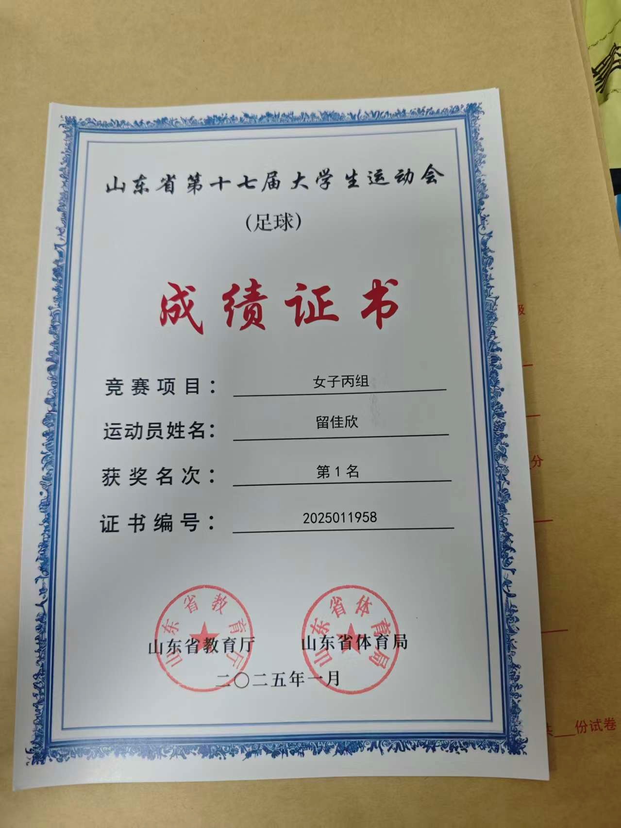 在2025年一月随聊城大学足球队参加山东省第十七届大学生运动会(足球)女子丙组获得第一名