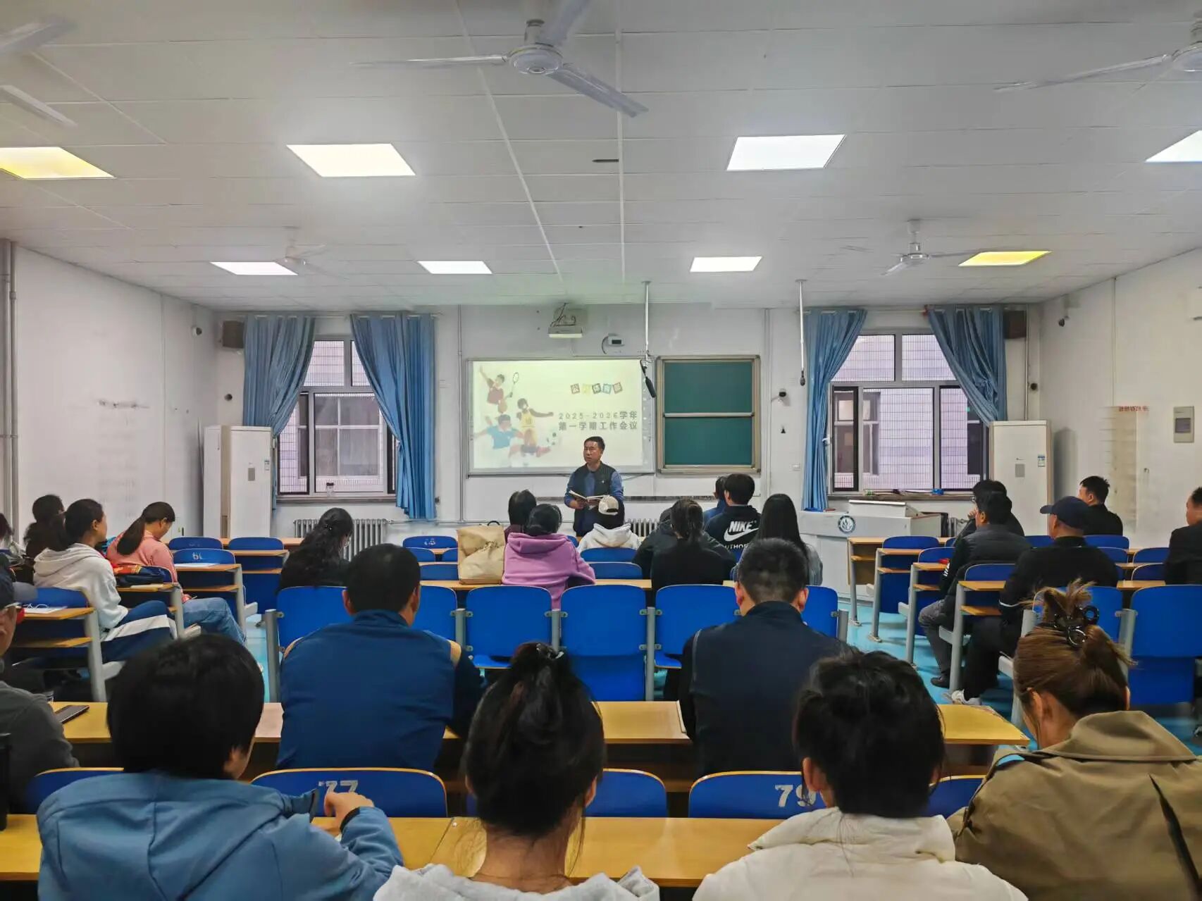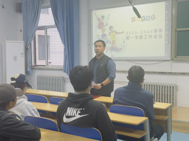 随后,公共体育部主任马晓老师围绕新学期工作进行具体安排部署。他从部门职能与工作范畴入手,系统梳理了公共体育部的职责定位;针对公共体育课程的成绩评定方式进行了细致说明,明确了考核标准与流程;并就保健课教学、体质健康测试、阳光健康跑、缓补考等关键环节逐一阐释,进一步规范教学管理过程。此外,马晓老师重点解读了课堂教学规范,强调要在保障课堂秩序的基础上持续提升教学质量,并介绍了“青年教师随堂学”活动及大学生体能趣味挑战赛的筹备情况,为新老教师的教学能力提升与学生体育活动的多元化开展指明了具体路径。
